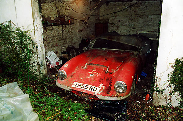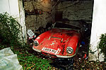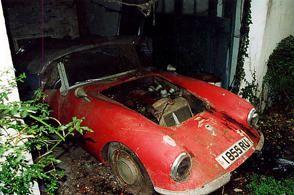Many years ago I was contact by Jackie Duckett who wanted to register with the Elva Owners Club that she had an early Trojan built Elva Courier with chassis number E1012. The car was road registered '1855 RU' and Jackie used the car to the full, perhaps a little more than full as she was well known to the local police for driving the car around the local Suffolk villages in a noisy and extremely determined manner! She did not get involved with any Club activities and I was therefore deeply saddened to hear just before Christmas, that Jackie had died at far too young an age, the car having remained unused throughout her long illness. Luckily the car was mostly covered having been stored in an old stable block and at the request of the family I went to Suffolk to see the car and advise how it should be sold. The photographs show that time had certainly taken its toll but the car was very complete although on very flat tyres and locked solid. |