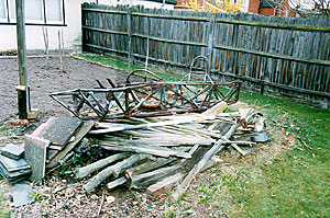 Imagine my anticipation as I walked into the rear garden but Mk.6 ... where? Over there on the wood pile! Blimey ... there it was, well at least a rather tatty, rusty and less than straight chassis ... I gulped as I enquired about the rest. Oh the body was no good but most of the car is under the work bench together with the Brabham.