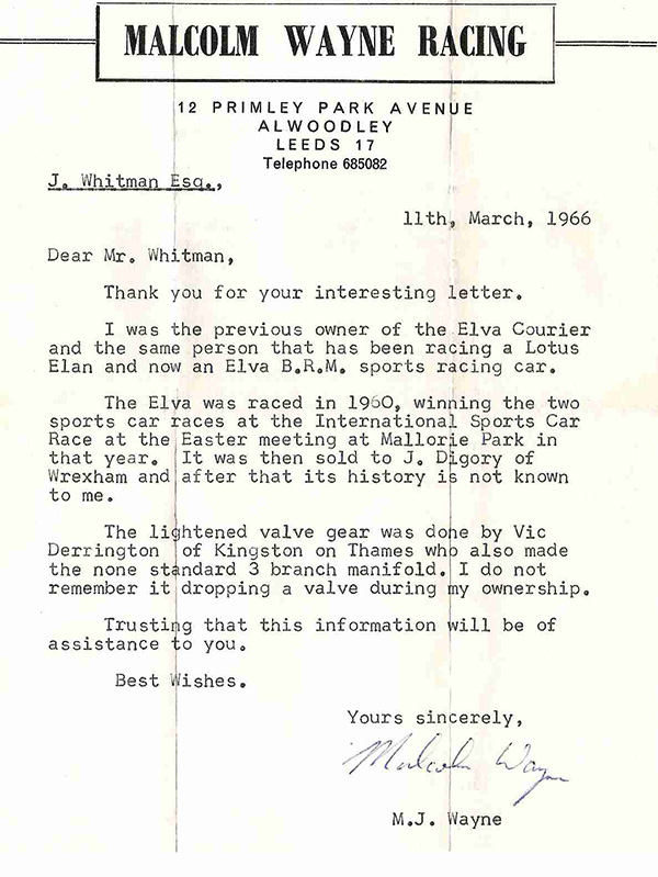 Introduction by Roger Dunbar ... There are many delights associated with the fabulous Goodwood Revival, one being the opportunity to meet with Elva people, often previous owners who enquire of the whereabouts of an old friend. In 2008 I chatted with Jerry Whitman about his ex. Malcolm Wayne Courier, and in July this year our paths crossed again in the pretty village of Burpham near Arundel. Just across the river from the imposing castle, stands the village pub, named the George & Dragon, and the landlord had arranged for a gathering of local ‘classics’ on the cricket field, so the ‘yellow peril’ Courier was called into action. After checking out the real ales on offer, including some bottles of Robbie’s Red (a hard job but someone has to do it), I returned to the Courier to find Jerry enthusing about the car. We again discussed his previous ownership of ‘9330 UG’ and thankfully Jerry was kind enough to put his fond memories into written words. Enjoy. You will soon learn from his story that Jerry is not only a talented engineer but a very likeable and interesting guy too.