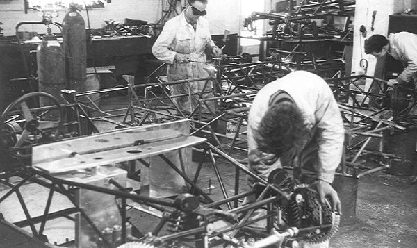 Interior of workshop showing assembly of a Mk II and further chassis frames being built.