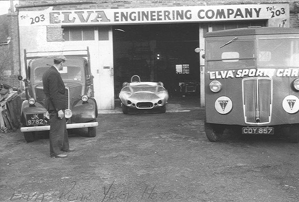 The additional premises acquired behind the York Hotel. Note the works transporter and the gleaming new Mk III sports racer. A justifiably proud Frank Nichols looks on.