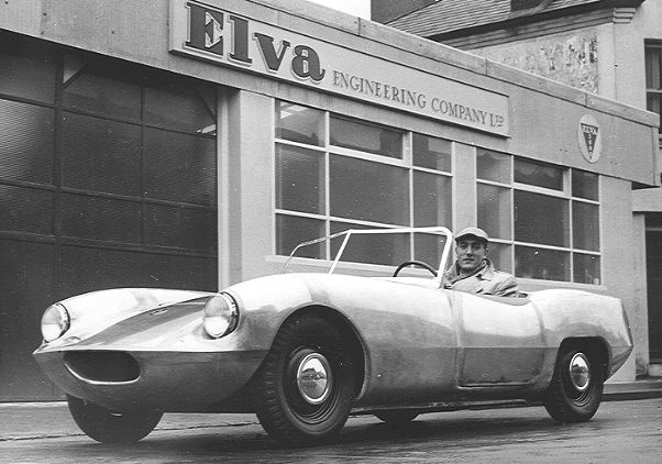 Frank shows off the prototype Courier outside the London Road garage. This car provided the basis for the GRP bodied production cars that followed.