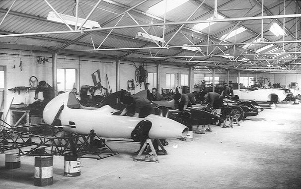 Front-engined Formula Juniors in production with Couriers and Sports Racers in the background.